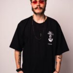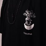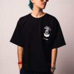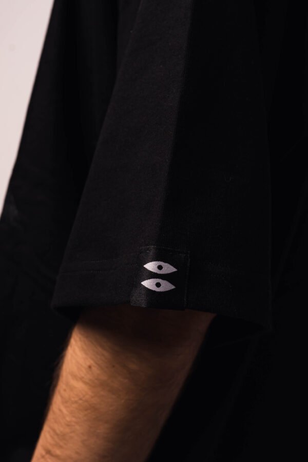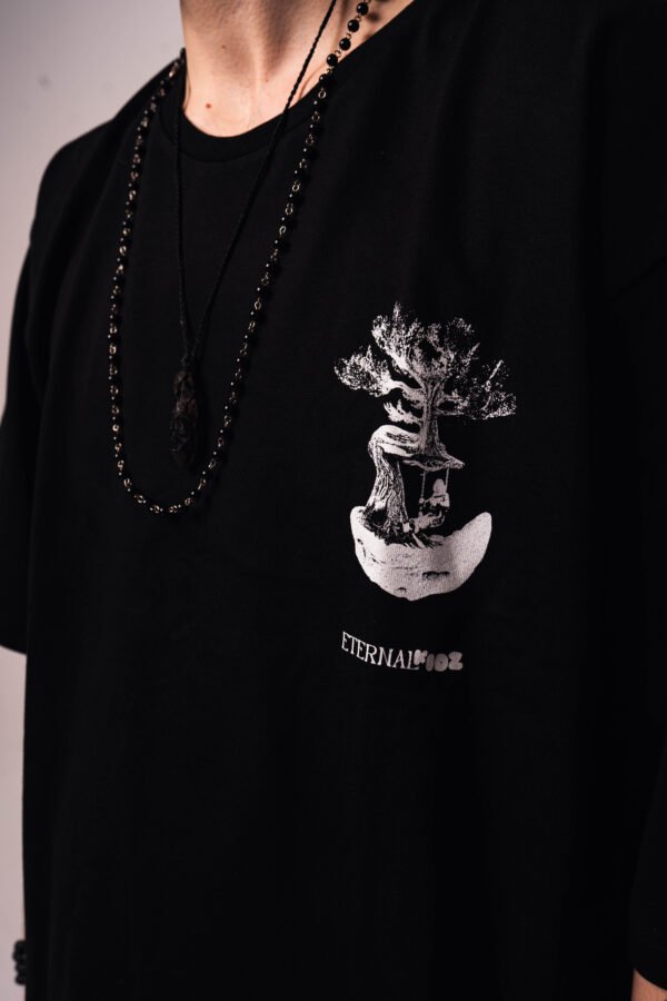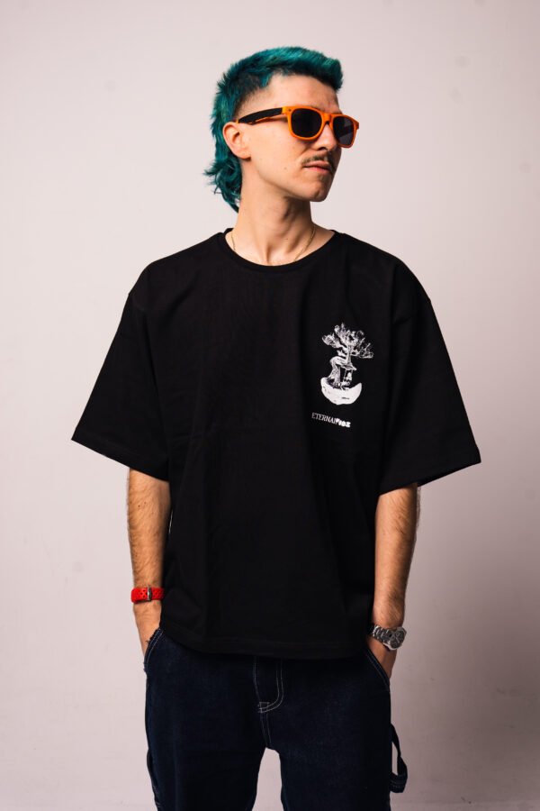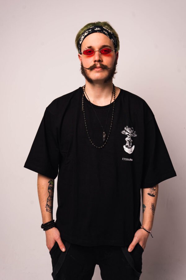 Czarny, bawełniany tshirt uszyty z najwyższej jakości materiałów. Nadruk na lewej piersi został wykonany sitodrukiem i nawiązuje do tematyki kolekcji – ETERNAL KIDZ.
